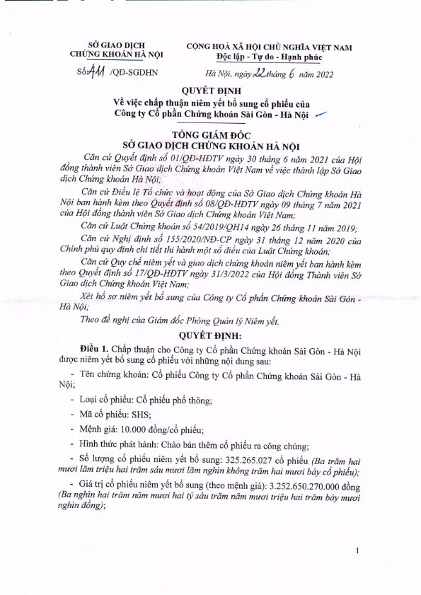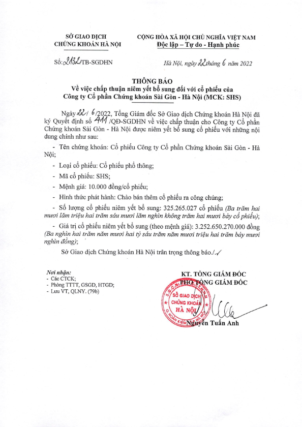 Ngày 27/6/2022, SHS đã nhận được Thông báo số 2132/TB-SGDHN ngày 22/06/2022 về việc chấp thuận niêm yết bổ sung đối với CP SHS.