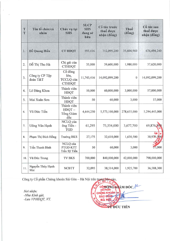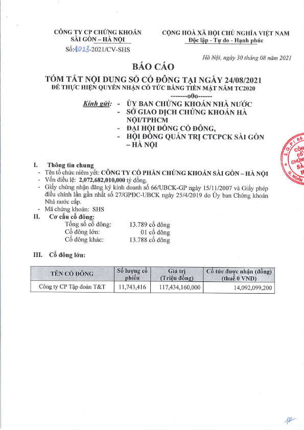 Công ty CP Chứng khoán Sài Gòn - Hà Nội báo cáo về cơ cấu cổ đông nhận cổ tức bằng tiền năm tài chính 2021 tại Ngày Đăng ký cuối cùng 24/08/2021.