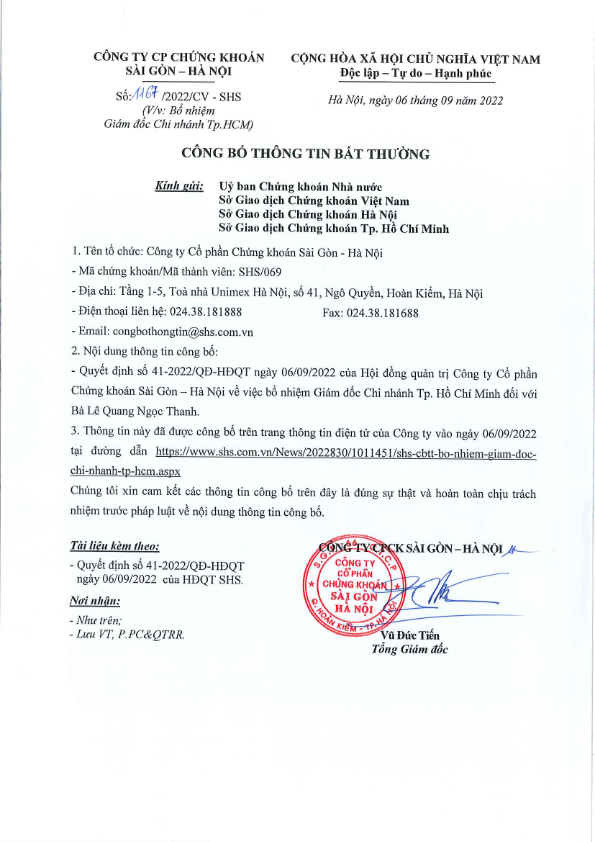 - SHS: CBTT thôi giữ chức vụ kiêm nhiệm Giám đốc Chi nhánh Tp.HCM - 05/09/2022