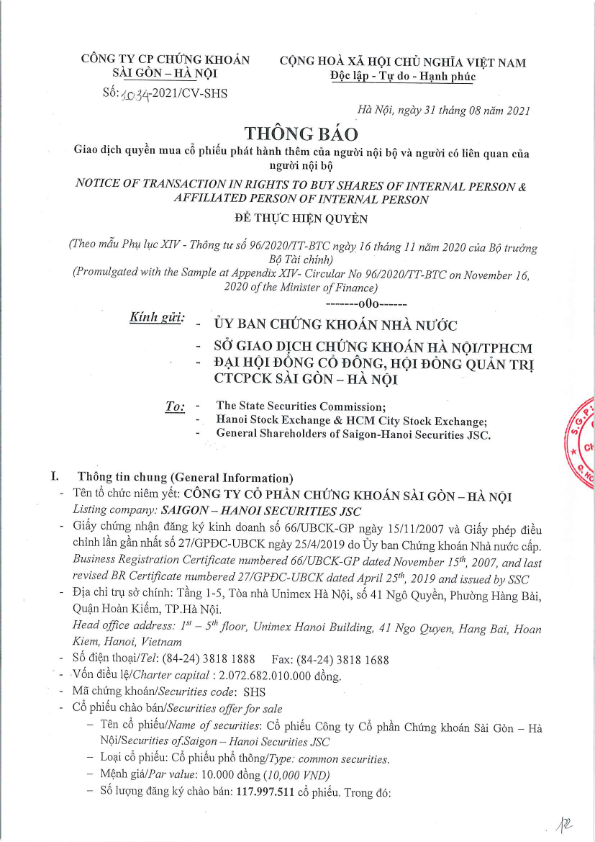 Công ty CP Chứng khoán Sài Gòn - Hà Nội (SHS) thông báo về việc thực hiện quyền mua cổ phiếu SHS phát hành thêm của Người nội bộ và Người/Tổ chức có liên quan trong đợt phát hành cổ phiếu tăng vốn điều lệ năm 2021 như sau: