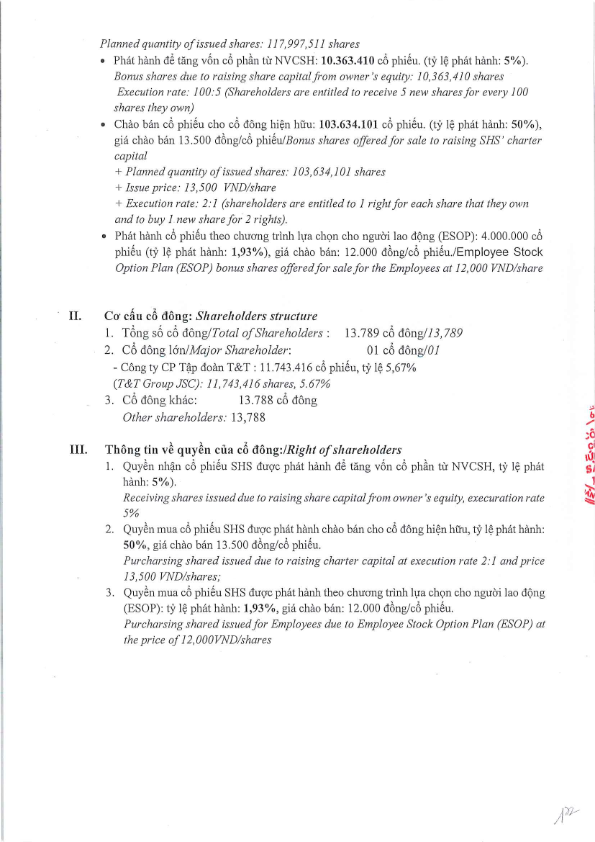 - T&T Group nhận và đăng ký mua toàn bộ CP SHS phát hành thêm năm 2021 - 29/09/2021