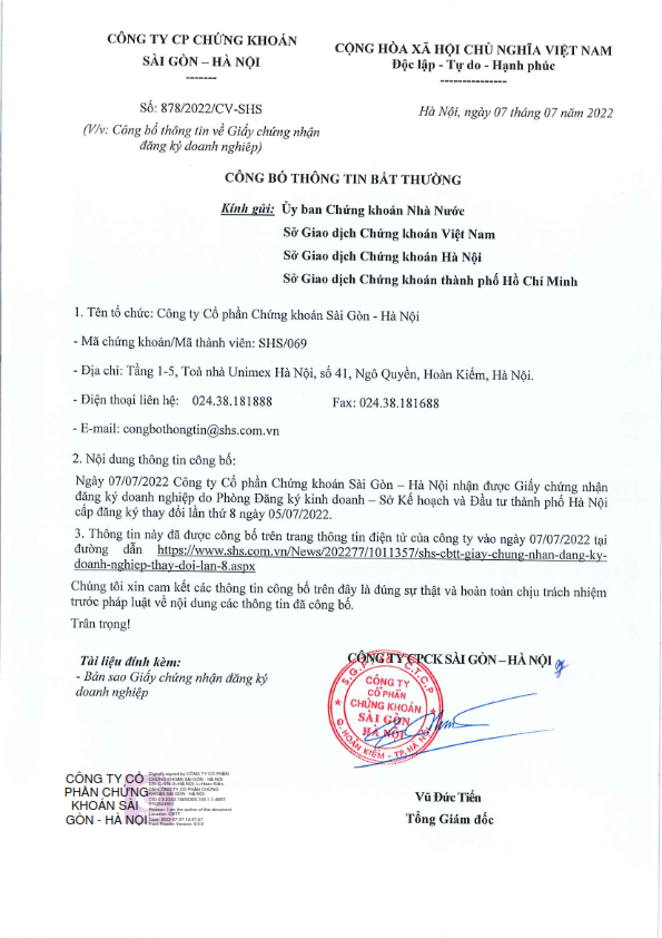 SHS: CBTT Giấy chứng nhận đăng ký doanh nghiệp thay đổi lần 8