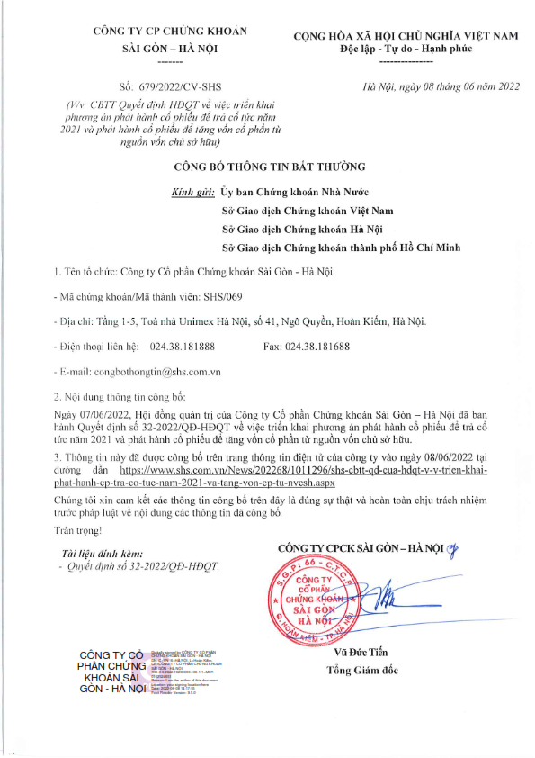 SHS: CBTT QĐ của HĐQT v.v triển khai phát hành CP trả cổ tức năm 2021 và tăng vốn CP từ NVCSH