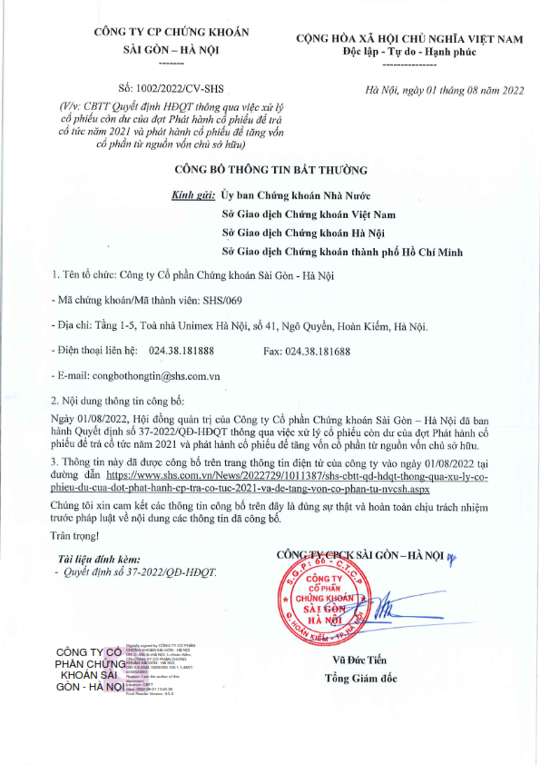 SHS: CBTT QĐ HĐQT thông qua xử lý cổ phiếu dư của đợt Phát hành CP trả cổ tức 2021 và để tăng vốn cổ phần từ NVCSH