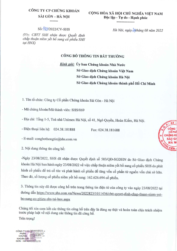 Ngày 23/8/2022, SHS đã nhận được Thông báo số 2676/TB-SGDHN và Quyết định số 583/QĐ-SGDHN ngày 23/8/2022 của Sở GDCK Hà Nội về việc chấp thuận niêm yết bổ sung đối với CP SHS.