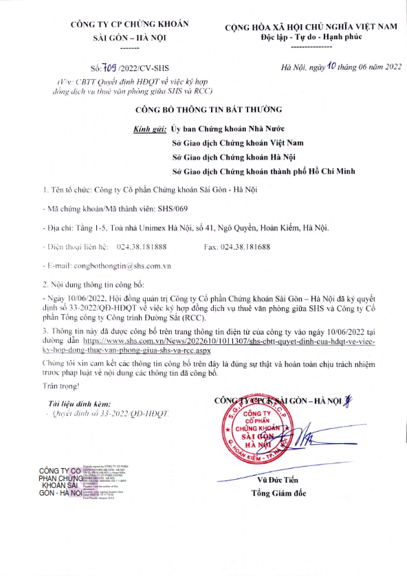SHS: CBTT Quyết định của HĐQT về việc ký hợp đồng thuê văn phòng giữa SHS và RCC