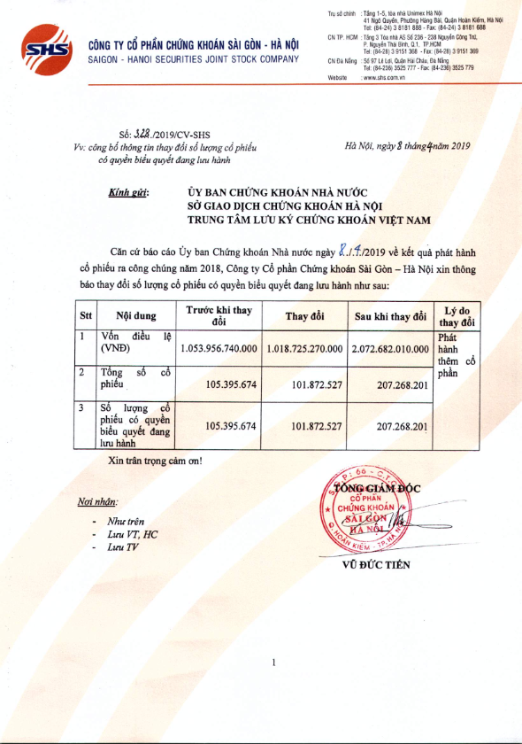 - CBTT: Ủy ban Chứng khoán Nhà nước chấp nhận báo cáo kết quả phát hành của SHS - 11/04/2019