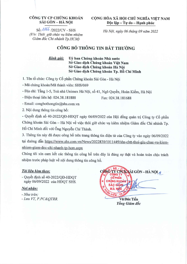 - SHS: CBTT Bổ nhiệm Giám đốc Chi nhánh Tp.HCM - 05/09/2022