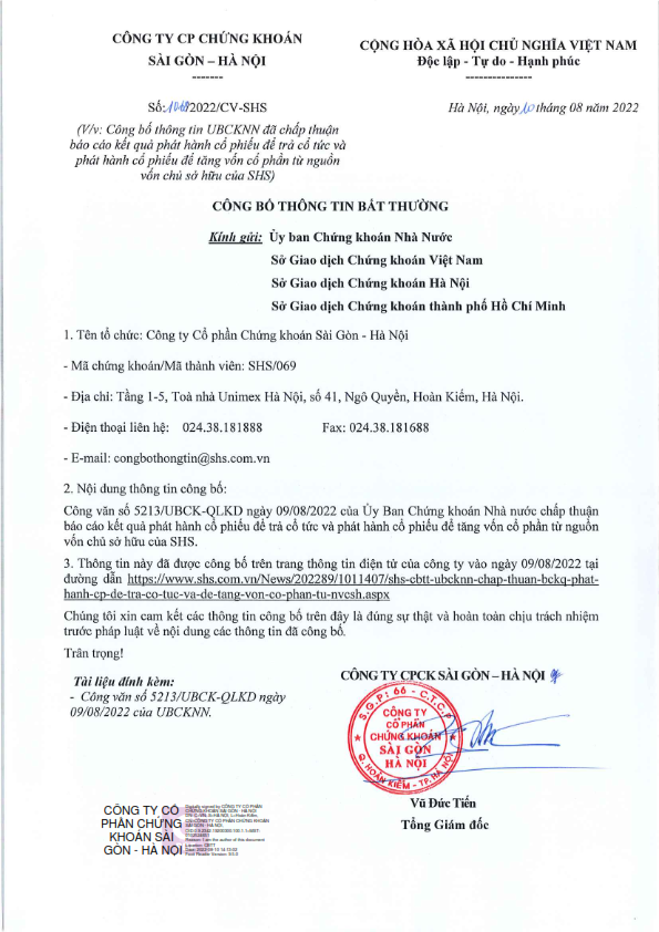 - SHS: Thông báo thay đổi lượng cổ phiếu lưu hành do Đợt phát hành cổ phiếu để trả cổ tức năm 2021 và phát hành cổ phiếu để tăng vốn cổ phần từ nguồn vốn chủ sở hữu - 01/08/2022