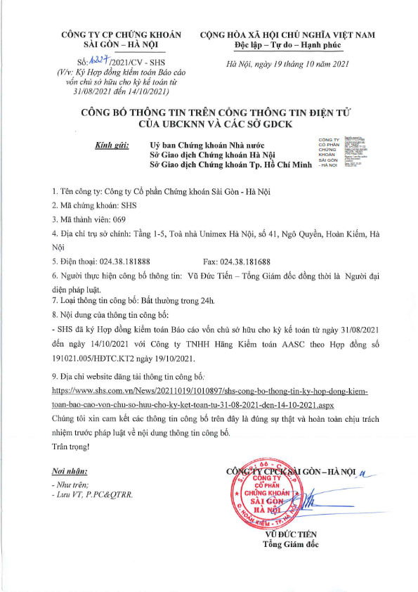 SHS: Công bố thông tin ký Hợp đồng kiểm toán Báo cáo vốn chủ sở hữu cho kỳ kết toán từ 31/08/2021 đến 14/10/2021