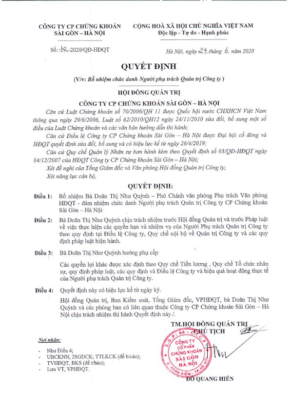 SHS: Công bố thông tin Quyết định của HĐQT về việc bổ nhiệm Người phụ trách quản trị Công ty