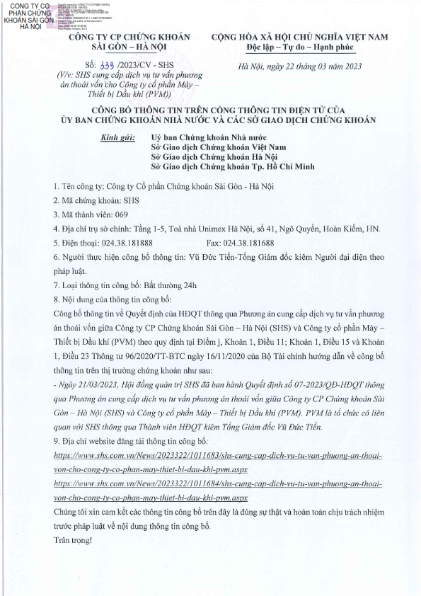 - SHS: CBTT Báo cáo tỷ lệ an toàn tài chính năm 2022 đã được kiểm toán - 27/03/2023