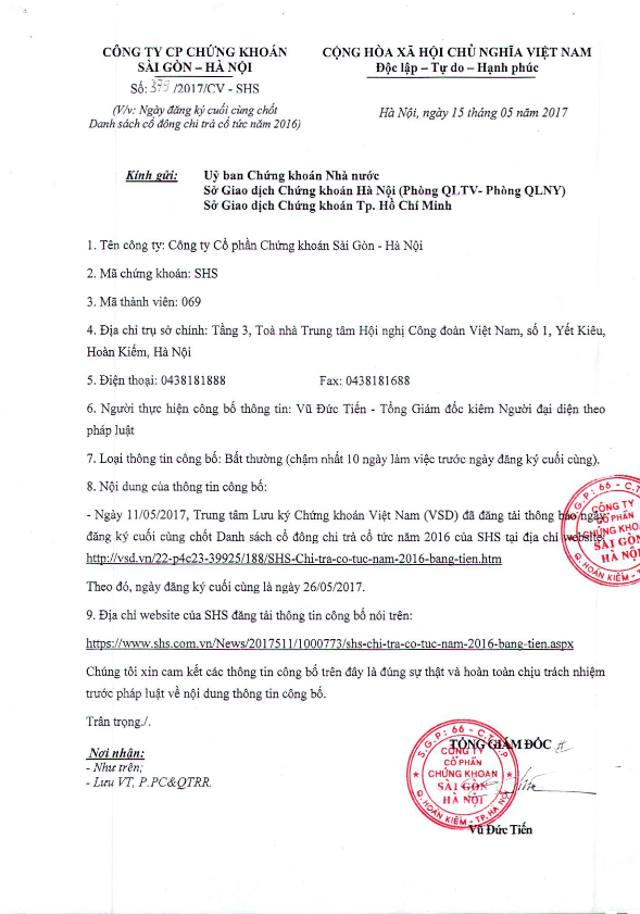 SHS: Ngày đăng ký cuối cùng chốt Danh sách cổ đông chi trả cổ tức năm 2016
