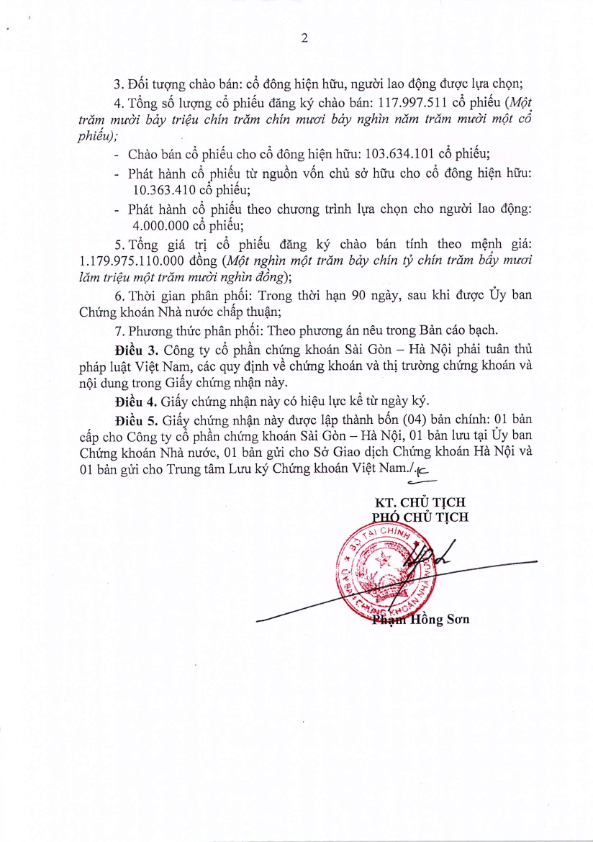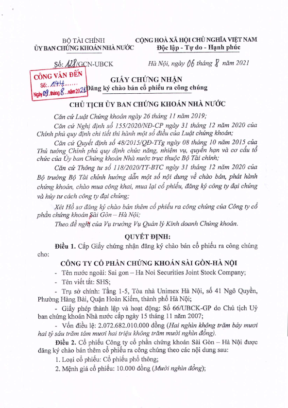 Ngày 09/08/2021, Công ty CP Chứng khoán Sài Gòn – Hà Nội đã nhận được Giấy Chứng nhận đăng ký chào bán cổ phiếu ra công chúng số 128/GCN-UBCK do Ủy ban Chứng khoán Nhà nước cấp ngày 06/08/2021.