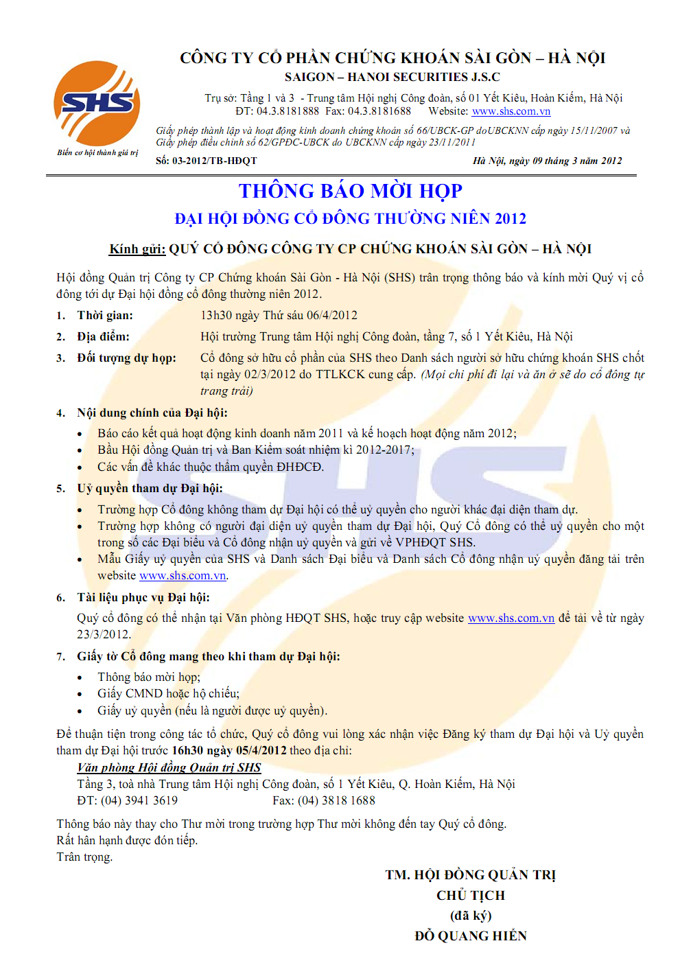 SHS thông báo mời họp ĐHĐCĐ thường niên 2012