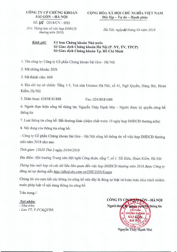 SHS: Thông báo về việc họp ĐHĐCĐ thường niên 2018