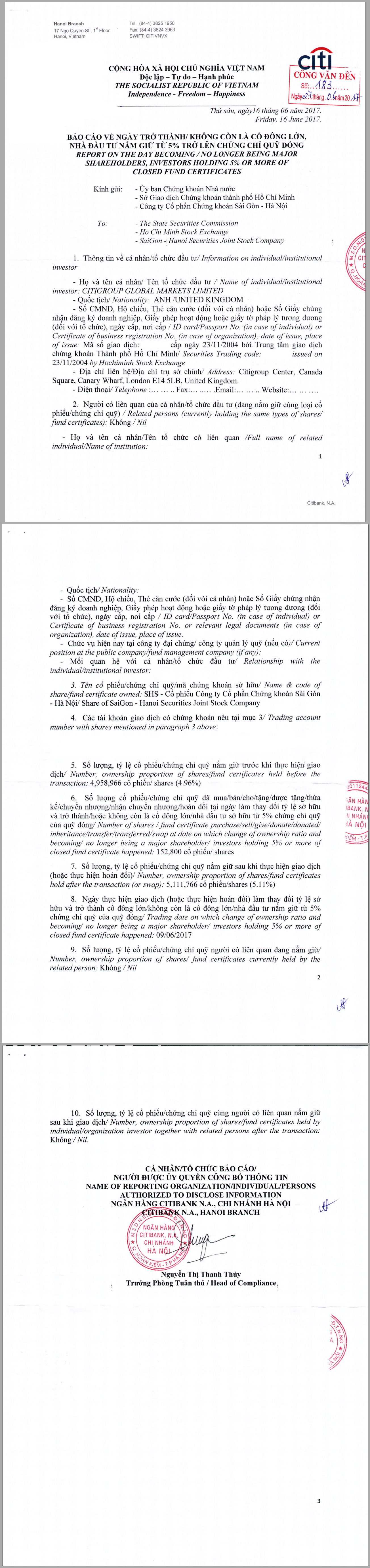 Thông báo về việc Citigroup Global Markets Limited trở thành cổ đông lớn của SHS