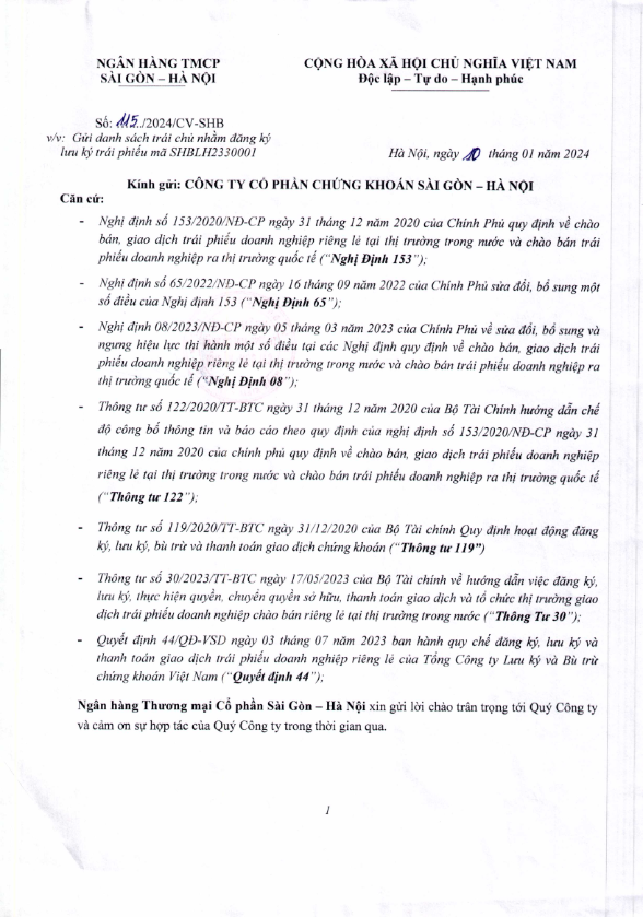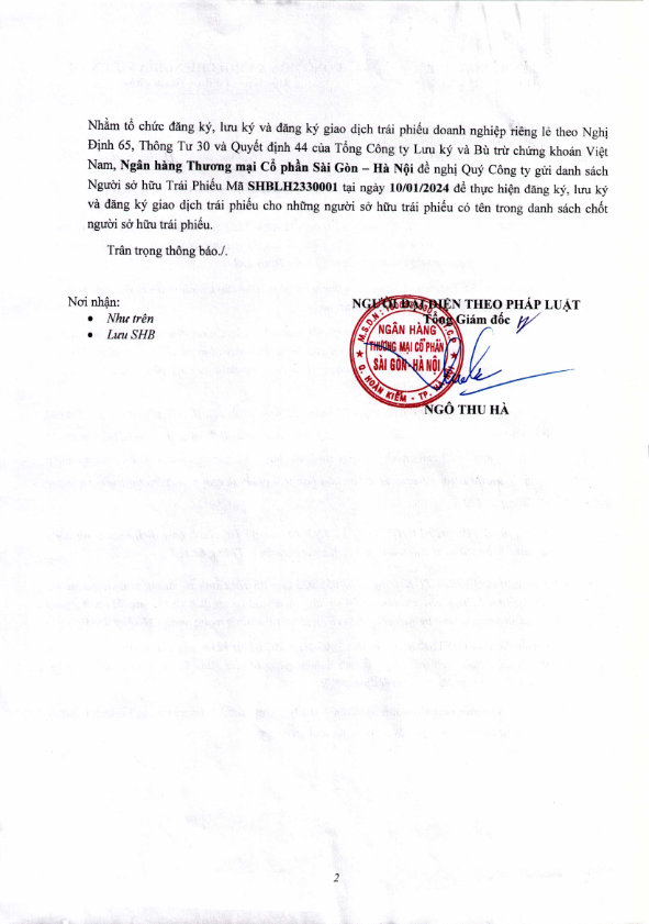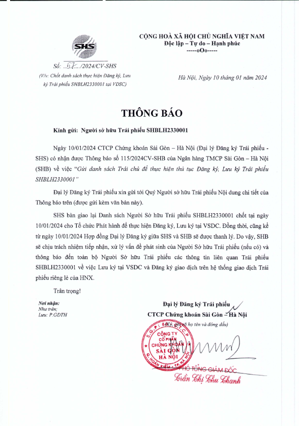 SHBLH2330001_Thông báo ngày Chốt DS Trái chủ để Đăng ký và lưu ký trên VSDC
