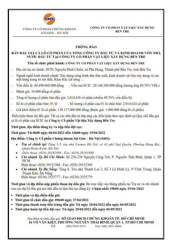 Thông báo bán đấu giá cả lô cổ phần của tổng công ty đầu tư và kinh doanh vốn nhà nước đầu tư tại CTCP vật liệu xây dựng Bến Tre