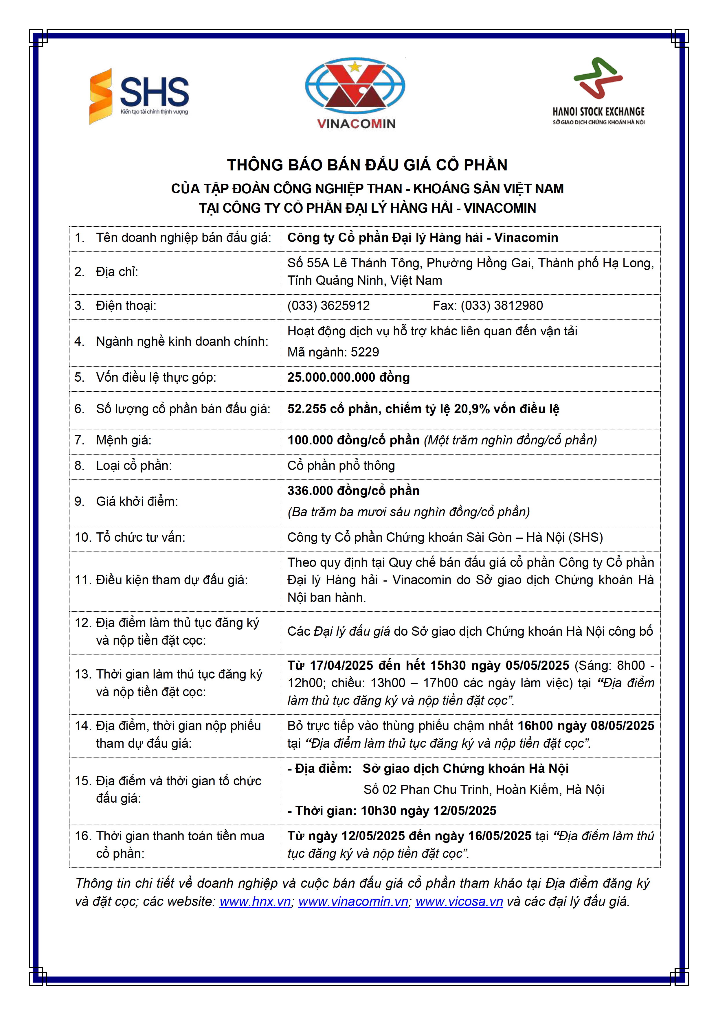 - Thông báo đấu Công ty Cổ phần Đại lý Hàng hải - Vinacomin - 17/04/2025