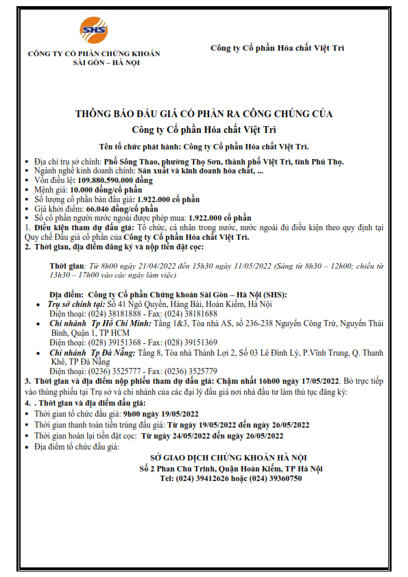 Thông báo bán đấu giá cổ phần CTCP Hoá chất Việt Trì