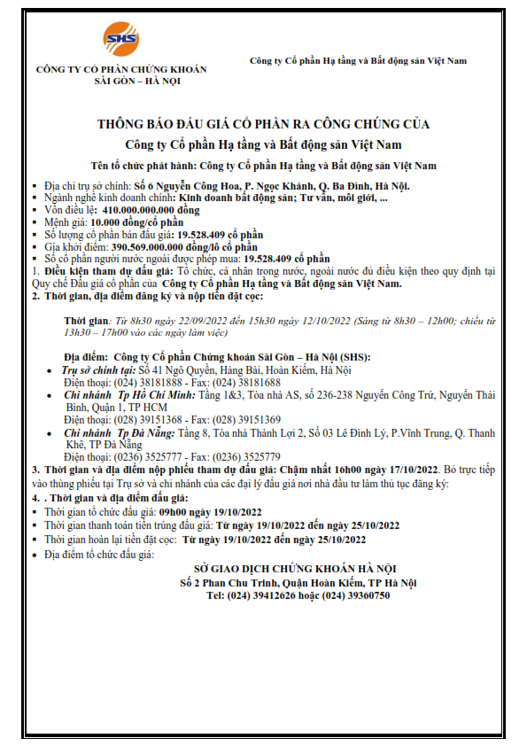 Thông báo bán đấu giá cổ phần của Công ty Cổ phần Hạ tầng và Bất động sản Việt Nam