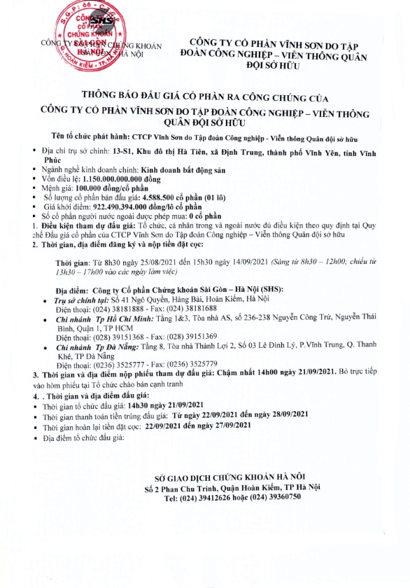 Thông báo bán đấu giá Cổ phần của CTCP Vĩnh Sơn do Tập đoàn Công nghiệp - Viễn thông Quân đội sở hữu