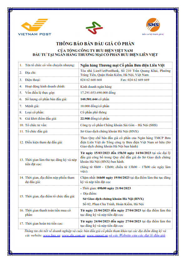 - Thông báo bán đấu giá cp của Ngân hàng TMCP Bưu điện Liên Việt - 15/03/2023