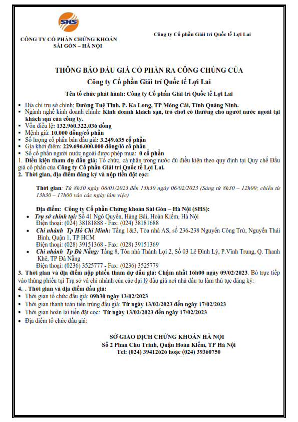 Thông báo bán đấu giá cp của Công ty Cổ phần Giải trí Quốc tế Lợi Lai