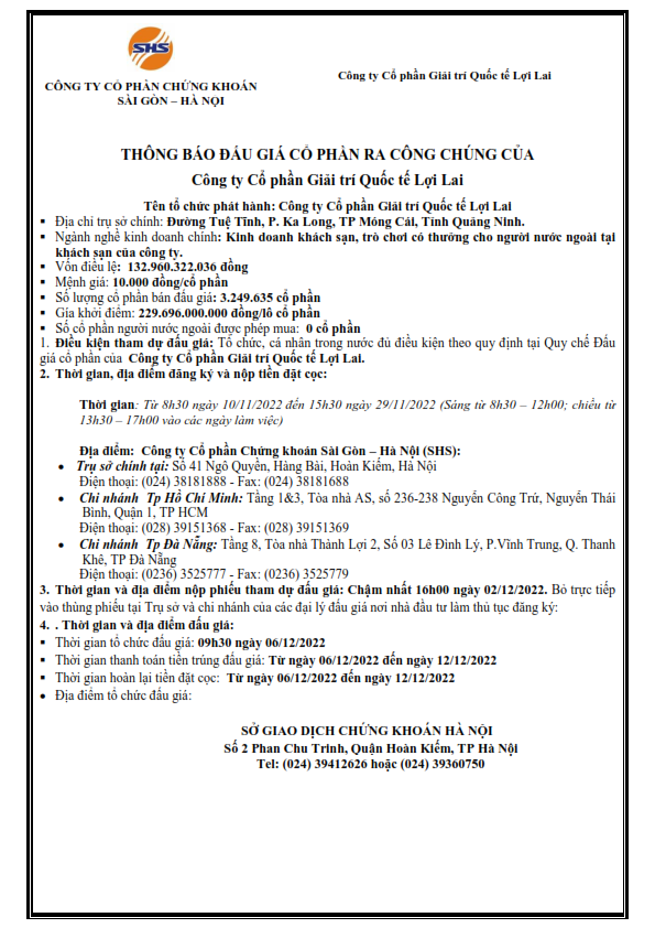 Thông báo bán đấu giá cp của Công ty Cổ phần Giải trí Quốc tế Lợi Lai