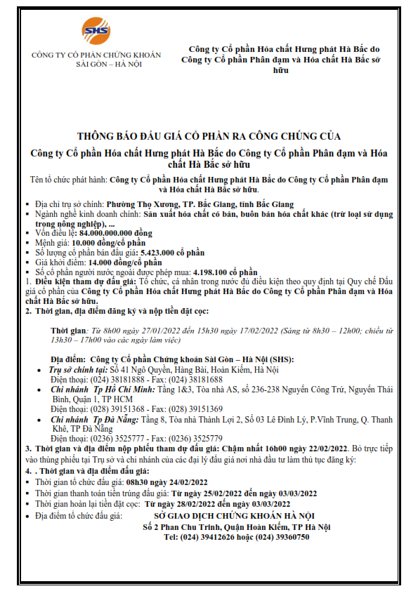 Thông báo bán đấu giá cp của Công ty Cổ phần Hóa chất Hưng phát Hà Bắc do Công ty Cổ phần Phân đạm và Hóa chất Hà Bắc sở hữu