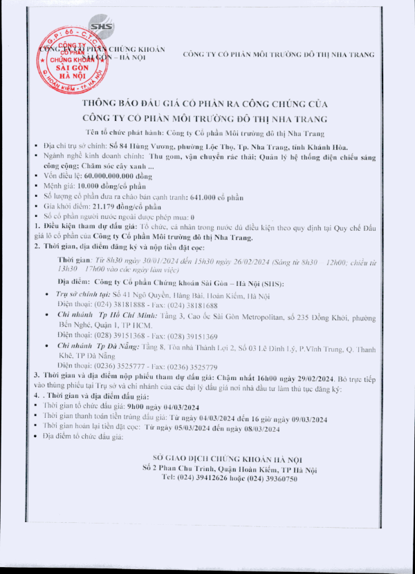 Thông báo bán đấu giá cp của Công ty Cổ phần Môi trường đô thị Nha Trang