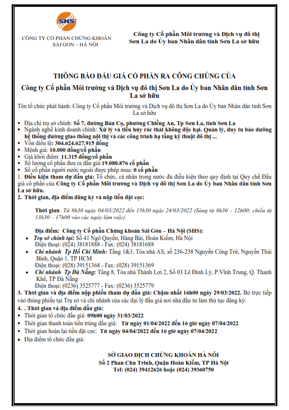 Thông báo bán đấu giá cp của Công ty Cổ phần Môi trường và Dịch vụ đô thị Sơn La do Ủy ban Nhân dân tỉnh Sơn La