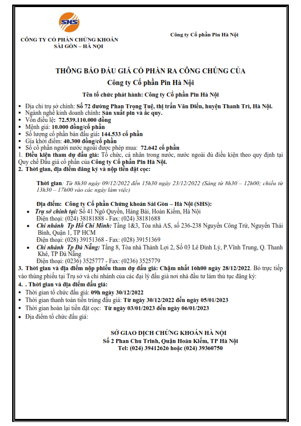 Thông báo bán đấu giá cp của Công ty Cổ phần Pin Hà Nội