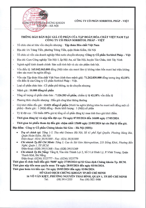Thông báo bán đấu giá cp của Công ty Cổ Phần Sorbitol Pháp Việt