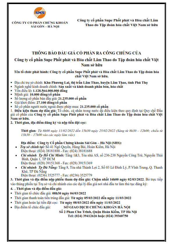 Thông báo bán đấu giá cp của Công ty cổ phần Supe Phốt phát và Hóa chất Lâm Thao do Tập đoàn hóa chất Việt Nam sở hữu