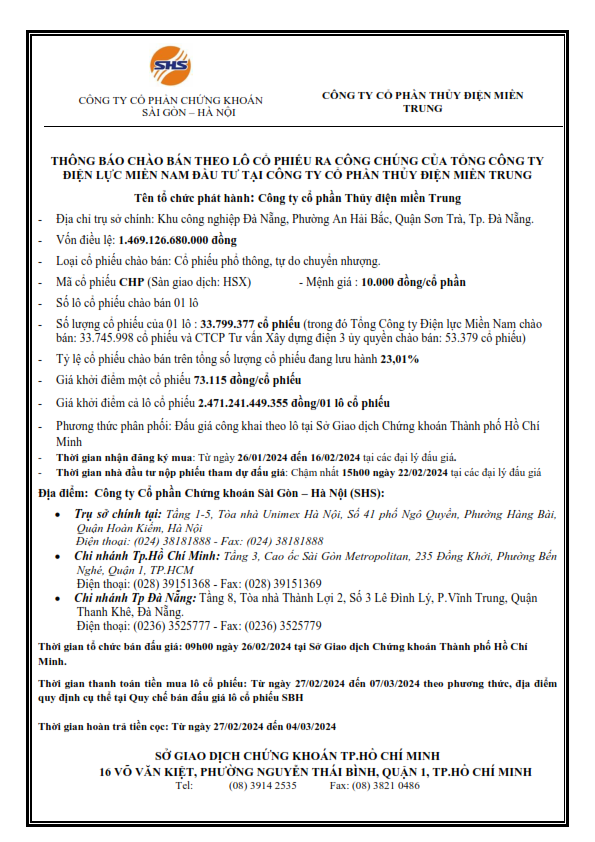 Thông báo bán đấu giá cp của Công Ty Cổ Phần Thủy điện Miền Trung