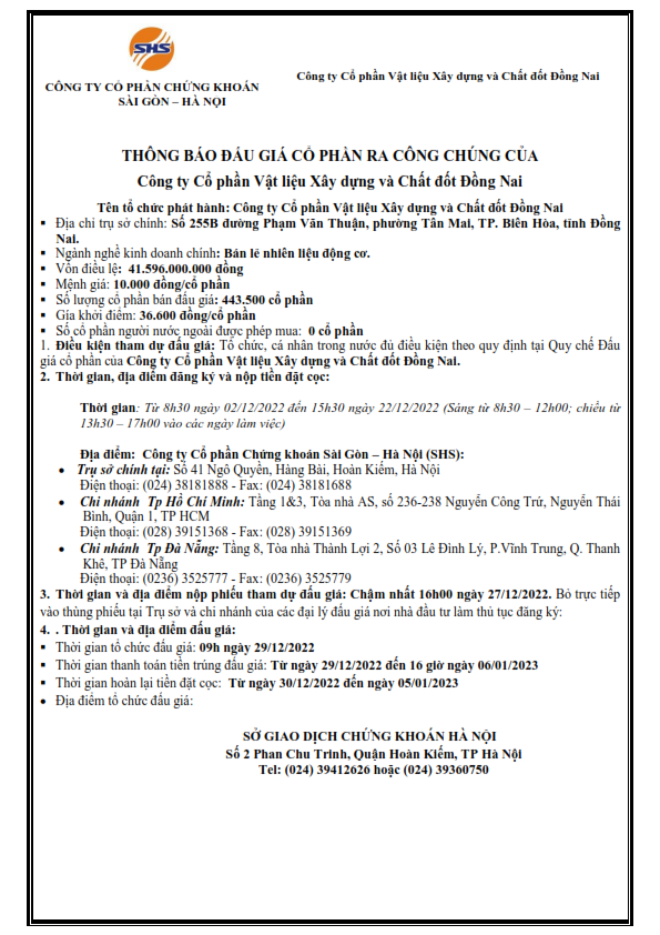 Thông báo bán đấu giá cp của Công ty Cổ phần Vật liệu Xây dựng và Chất đốt Đồng Nai