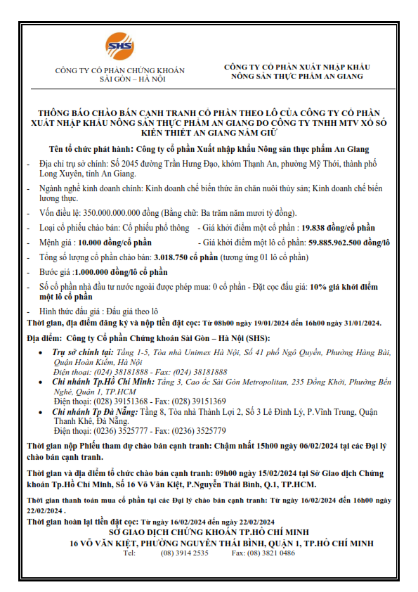 Thông báo bán đấu giá cp của Công ty Cổ phần XNK Nông sản thực phẩm An Giang
