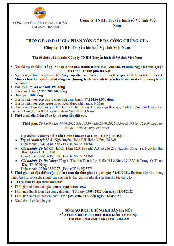 Thông báo bán đấu giá cp của Công ty TNHH Truyền hình số Vệ tinh Việt Nam