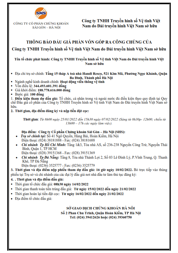 Thông báo bán đấu giá cp của Công ty TNHH Truyền hình số Vệ tinh Việt Nam