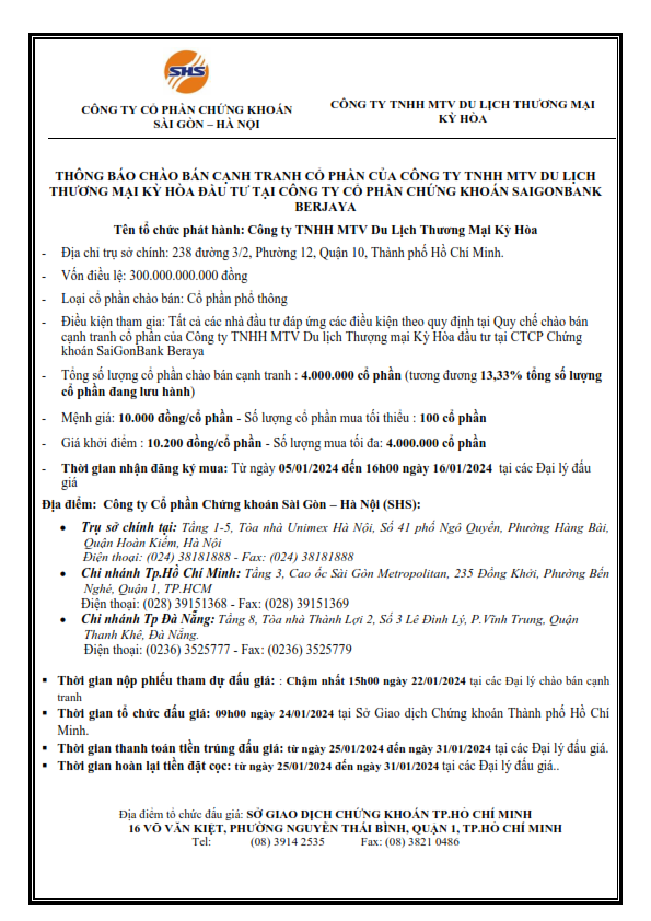 Thông báo bán đấu giá cp của CT TNHH MTV DL TM Kỳ Hòa