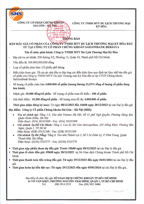 Thông báo bán đấu giá cp của CT TNHH MTV DL TM Kỳ Hòa