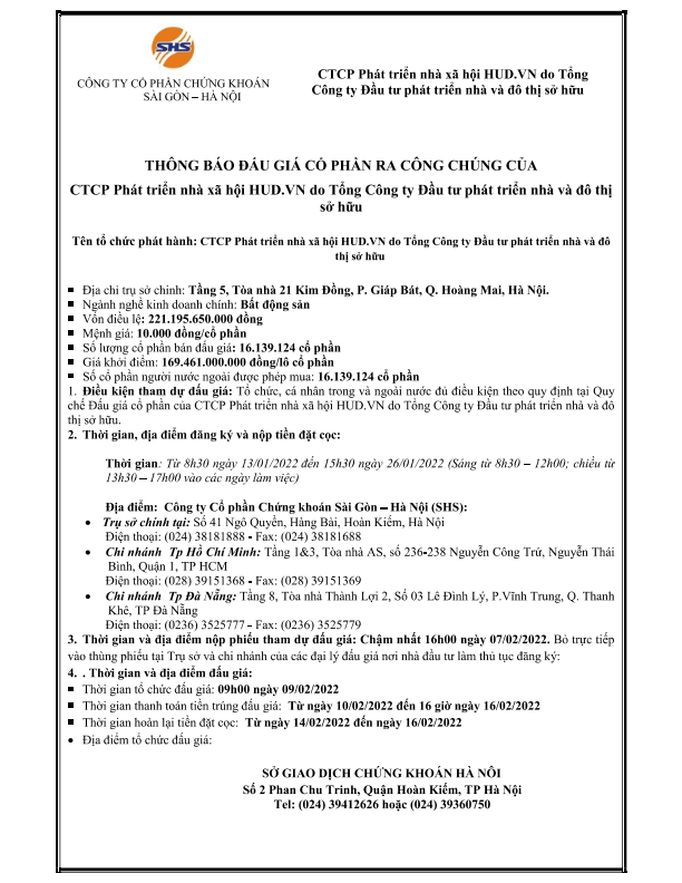 Thông báo bán đấu giá cp của CTCP Phát triển nhà xã hội HUD.VN do Tổng Công ty Đầu tư phát triển nhà và đô thị sở hữu