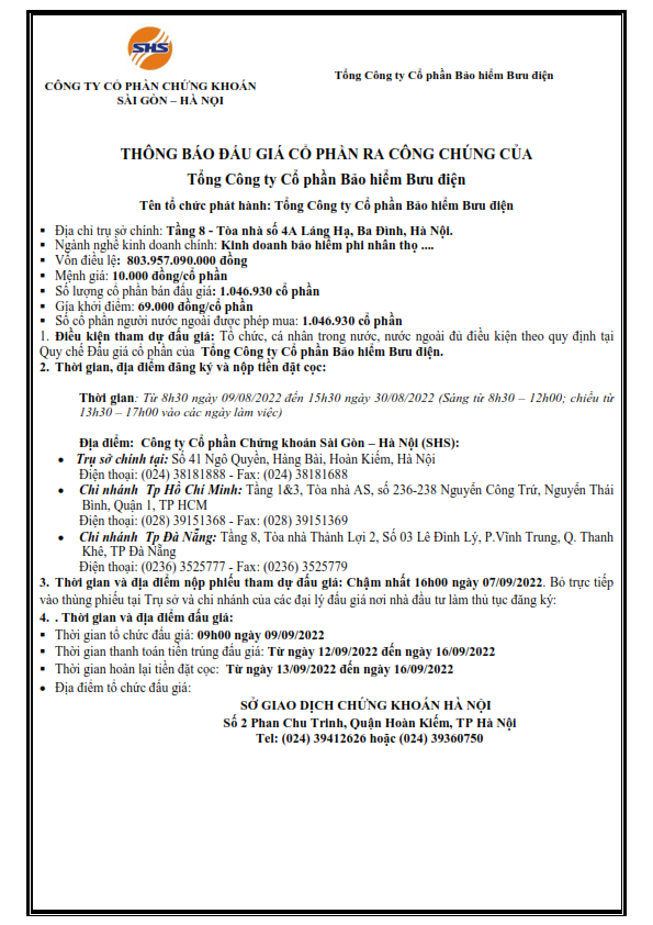 Thông báo bán đấu giá cp của Tổng Công ty Cổ phần Bảo hiểm Bưu điện