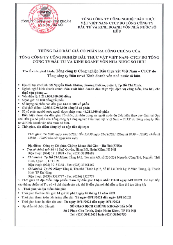 Thông báo bán đấu giá cp của Tổng Công ty Công nghiệp Dầu thực vật Việt Nam - CTCP do Tổng công ty Đầu tư và Kinh doanh vốn Nhà nước sở hữu