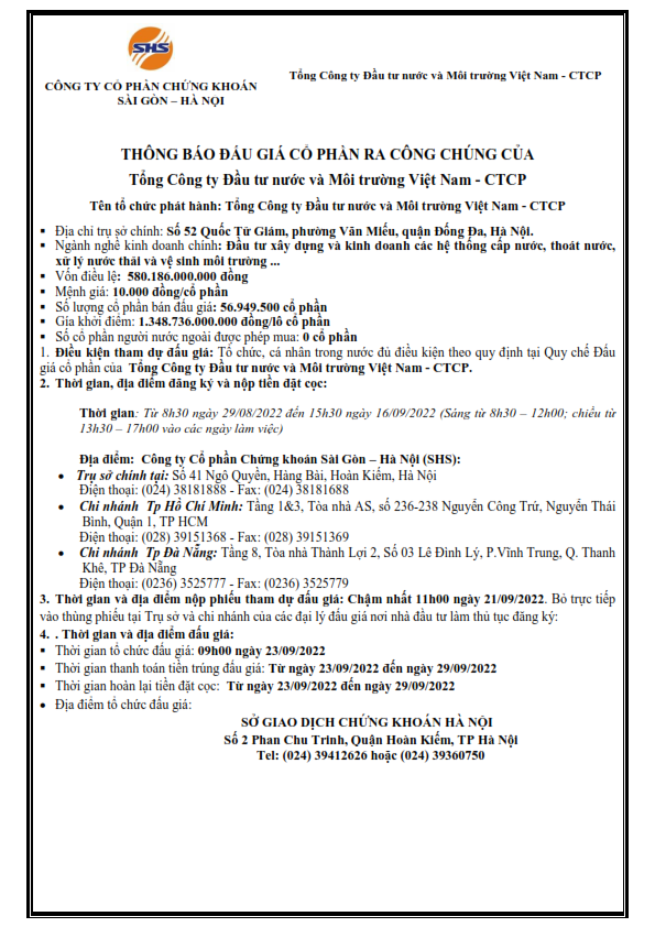 Thông báo bán đấu giá cp của Tổng Công ty Đầu tư nước và Môi trường Việt Nam - CTCP