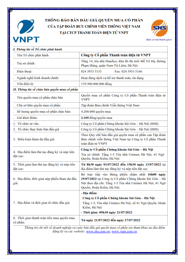 Thông báo bán đấu giá quyền mua cổ phần của Tập đoàn Bưu chính viễn thông Việt Nam tại CTCP Thanh toán điện tử VNPT