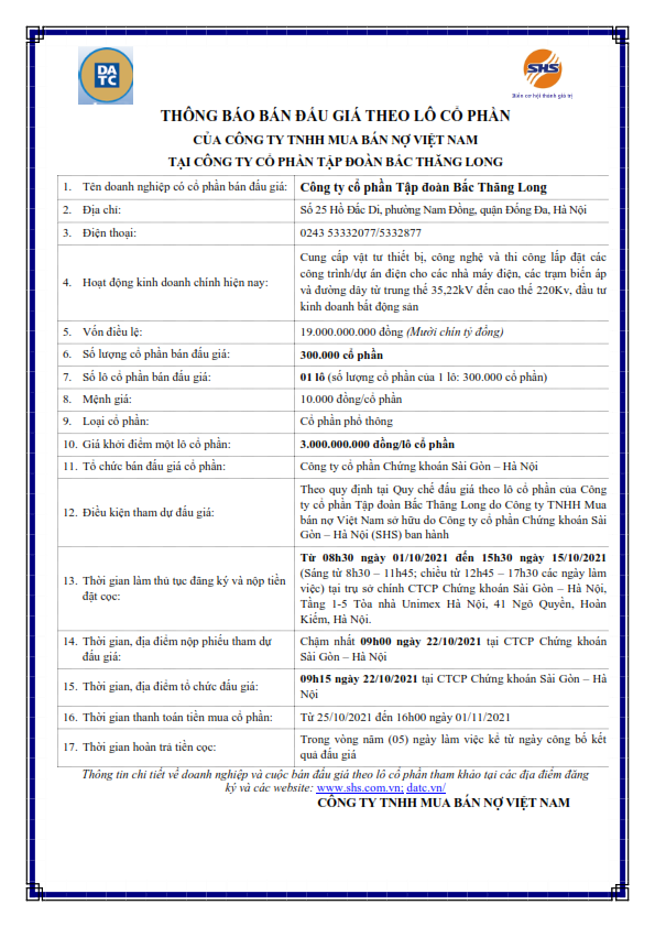 Thông báo bán đấu giá theo lô cổ phần của công ty TNHH Mua bán nợ Việt Nam tại CTCP Tập đoàn Bắc Thăng Long
