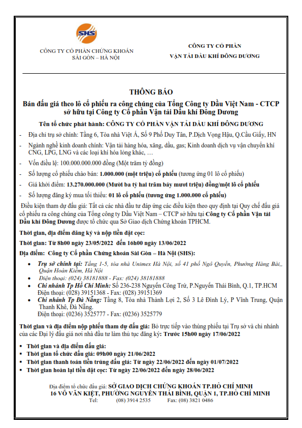 Thông báo bán đấu giá theo lô cổ phiếu ra công chúng của Tổng công ty Dầu Việt Nam - CTCP Sở hữu tại CTCP Vận tải dầu khí Đông Dương